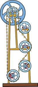 图4-10 中,有一条又粗又重的锁链套在五个大小不一的齿轮上。很显然,右边的锁链要比左边的大约长一半。于是,所谓的发明家们就洋洋自得地认为,这个装置会失去平衡,右边的锁链会不断往下坠,而左边的锁链呢,会不断往上升,整个装置就会不断地转动起来。果真如此吗?