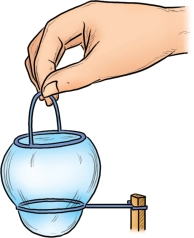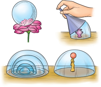 我们也可以用小型的石膏像替代花朵或小花瓶做上面的实验。不过,我们事先往石膏像上浇一些肥皂水,等大泡泡吹出来后,还可以把管子插进大泡泡里去吹石膏像上的小肥皂泡,将它们吹大(如图5-16右下所示)。