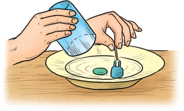 取一个平底的大盘子放平,在盘中放一枚硬币,然后倒入水淹没硬币。考考你,你能用手把硬币取出来而不会被水沾湿吗?