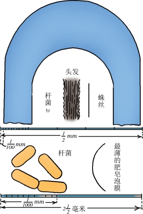 图5-19 上方为放大200倍的针鼻、头发、杆菌和蜘蛛丝。下方为放大40 000倍的杆菌和最薄的肥皂泡薄膜