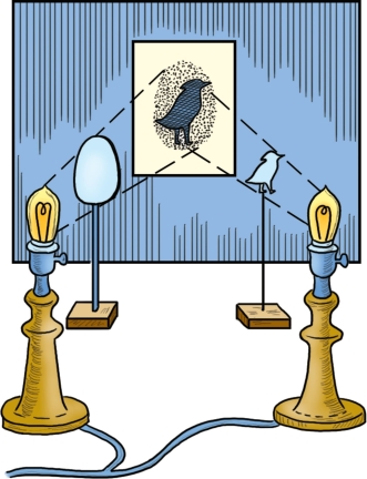 你可以利用影子的这种特性,表演一个有趣的魔术。取一张白纸,把它浸在油里。在一张硬纸板的中央剪出一小洞孔,将油浸过的白纸贴在洞孔上,于是一个油屏幕就制作成了。请你的伙伴站在幕前观看;而在幕后呢,你要放两盏灯。你先打开一盏灯,比如先打开左面的那盏。不过在打开前,你要在灯和油纸幕之间放一个椭圆形的纸片。这样,打开灯后,一枚鸡蛋的影像就出现在屏幕上。好了,现在你可以向你的朋友宣布,见证奇迹的时刻到了,让他们注意观看,并说你稍后会打开X射线透视机,他们就可以清楚地看到鸡蛋里的小鸡雏形。右边的灯点亮了,果然在鸡蛋的内部出现了一个鸡雏的影像(图7-4)。