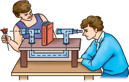 与这个有趣的玩具类似的工具在军事上得到了广泛的应用。通过这种叫“潜望镜”的仪器(图8-2),战士们就可躲在战壕里观看敌人的行动,不必再把头伸出去,更不必走到外边去冒险观察了。