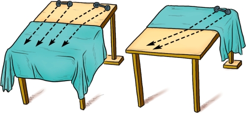 我们可以利用手头有的一些小物品做一个小实验。取一张台布铺盖在一半的桌子上(如图8-15),然后用一些东西垫起桌子的两脚,让桌面微微倾斜。把一对小轮子(可从损坏的玩具车上拆下来)固定在一根轴上,然后轮子轴放在高处,让它向下滚。如果轮子滚动的方向跟台布的边缘垂直的话,那么经过台布和桌面的分界线时,轮子的滚动路线不会发生偏转。这表明了光学的一条重要定律,光从一种介质射向另一种介质时,如果光线垂直于两介质的交界面,那么光线不会偏折。