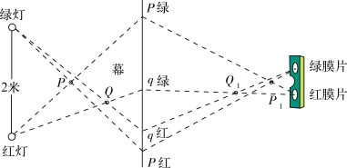 制造“奇特影子”的整个装置其实很简单,参看图9-15后,你就清楚明白了。红绿两个光源灯在图的左侧;放在灯和银幕中间的物体用P、Q表示,它们投射到银幕上的影子分别用p和q表示,影子旁边注有“红”“绿”的附注,分别表示受红光和绿光后的影子;而P1和Q1则是观众通过双色眼镜看到影子的位置。假设投放物所用的道具是只大“蜘蛛”,它从幕后的Q点移动到P点,观众看到它的影子呢,就像它向自己爬过来,从Q1爬到了P1