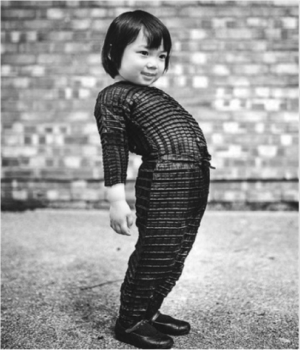 智能材料类的智能穿戴产品是借助特殊材料或特殊面料制作成衣服,这些特殊材料本身的特性使得智能材料类服装具有与普通服装不一样的功效。譬如,美国于2016年提出了“革命性纤维与织物”的国家级战略计划,目标是融合传统和现代技术,开发具有可视、可听、可感知、信息传感、温度调节、抗菌、变色等功能的纤维织物产品。再如,英国设计师瑞安·亚辛(Ryan Yasin)发明的可与孩子一起“长大”的智能童装(如图6-4所示)采用的是一种褶皱的面料,可随着孩子身型而变宽拉长。且这种褶皱服装不仅防水,还可以机洗,在省时、省力的同时还节约了孩子的穿戴成本。