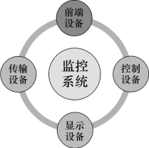 监控系统主要是通过电缆、微波、光纤等传输方式对采集到的图像、视频等数据信息进行传输,并对这些数据资料进行记录、存储、分析、处理与显示的智能化系统。监控系统可以真实、形象地再现监控场景,还原真相,可以代替人类在各种复杂的环境中进行长时间的监控。其主要包含前端设备(如摄像头、红外探测器、传感器、防护罩等设备)、传输设备(光线、双绞线等)、控制设备(监控管理平台)和显示设备(显示屏等)四部分(如图9-3所示)。目前以视频监控器为代表的众多前端设备已在学校、政府、医院、公司、超市、社区等公共场所随处可见。