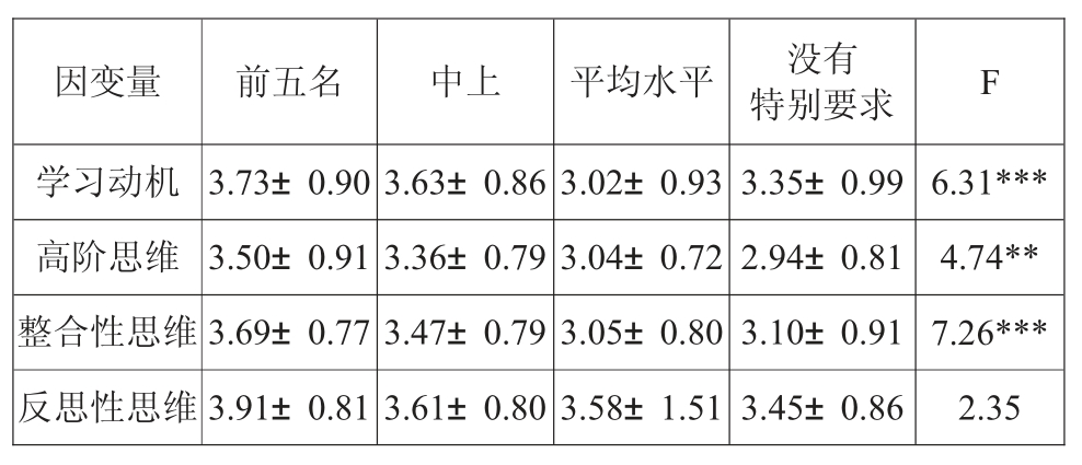 单因素方差分析结果表明,成绩期望不同的初中生,其深度学习动机(p<0.001)、高阶思维(p<0.01)、整合性思维(p<0.001)得分均存在显著差异,成绩期望不同的学生其反思性思维得分不存在显著差异(见表2)。