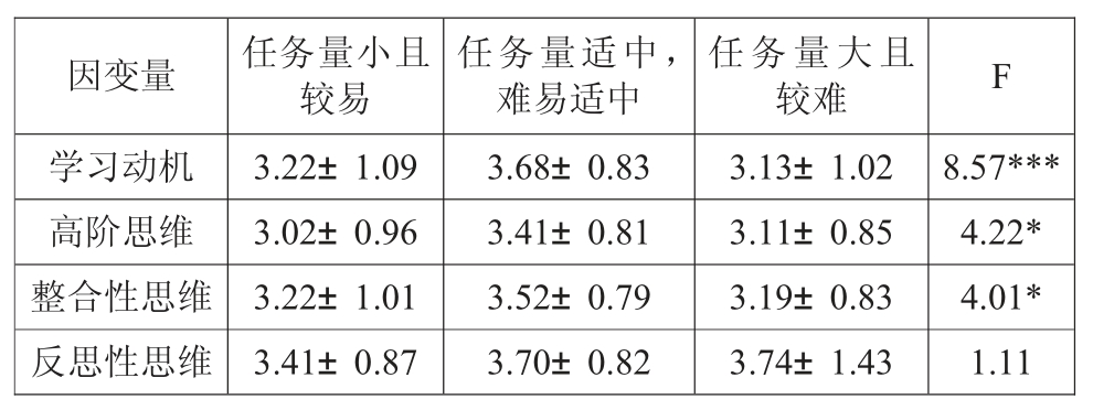 比较表明:初中生在学习任务量和难易程度均适中时的深度学习动机和高阶思维得分显著高于学习任务量小且较易及学习任务量大且难时的得分(ps<0.05);初中生在学习任务量和难易程度均适中时的整合性思维得分显著高于学习任务量大且较难时的得分(ps<0.05)。结果表明,学习任务量和任务难度适中时初中生的深度学习水平相对更好。