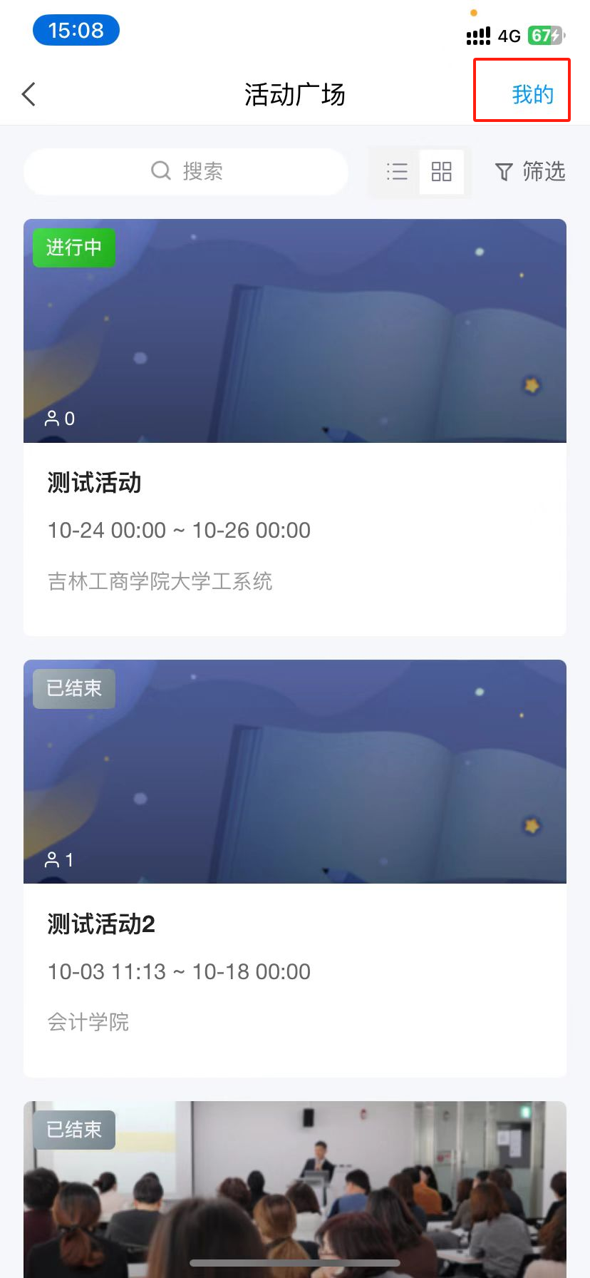 方式二:如果活动报名后,管理员发布了签到,学生可通过点击我的查看自己报名的活动来进行签到