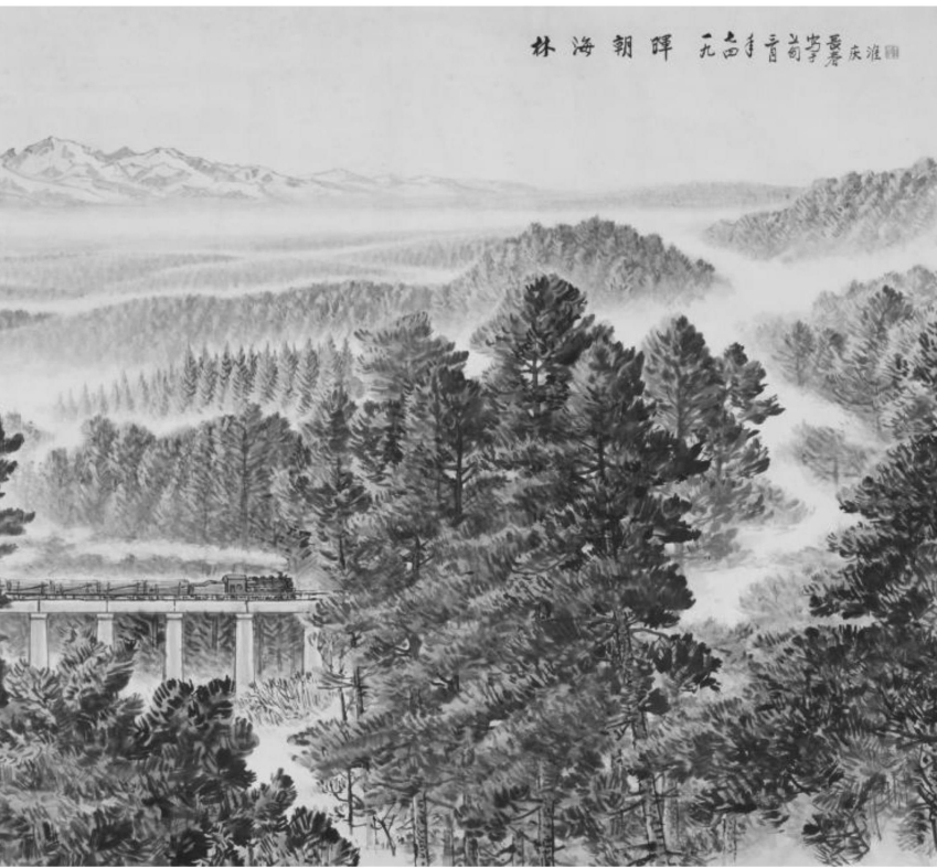 特别是画中红松的画法吸收了西方绘画艺术中光影体积塑造的方法,表现出红松特有的生命气息与韵味,打破了传统中国画法中符号式的松针叶画法,成为创新之举。与此同时,一列运送木材的小火车从左右两组松林间的悬空大桥上轰鸣而过,不但用现实手法点出了茫茫林海的勃勃生机,也带来了画面上黄金分割的美感。“关东画派”从此有了真正意义上的山水画的扛鼎之作,这也成为王庆淮的巅峰之作。就像传统的中国画表达的是当年当月当日当时那一刻的情怀一样,王庆淮的中国画在继承传统技法的同时,表达的也是他所属的那个时代。因为这画属于那个时代,属于那个人的情感与领悟,属于那个人土生土长的环境,才真正把艺术作品的生命交给了时间的永恒,打动了所有人的心灵,让一个表现一域的画作登上了世界艺术的高峰。