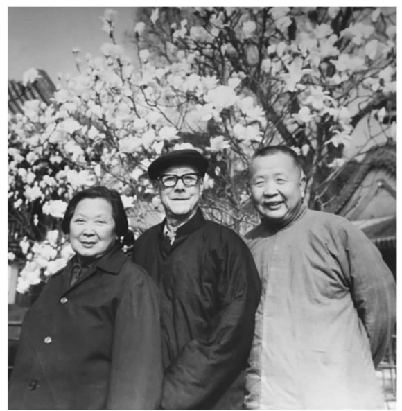 1980年4月,张伯驹夫妇与宋振庭(右)同赴北京颐和园赏花