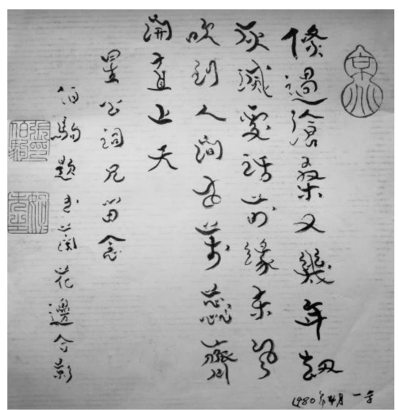 1980年4月,张伯驹夫妇与宋振庭同赴北京颐和园赏花并合影。这是张伯驹给宋振庭写在照片背面的赠诗