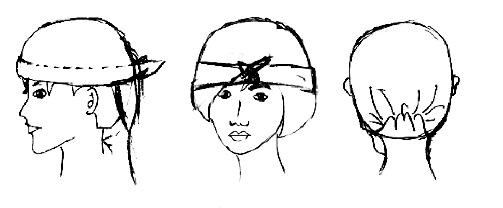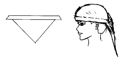 (2)顶角拉至枕后,左右两底角沿两耳上方往后拉至枕骨下方交叉并压紧顶角,然后再绕至前额打结,顶角拉紧并向上反折将角塞进两底角。