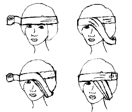 (2)从对侧额部斜下绕至伤眼,再经耳下绕至枕后,回到对侧额部,环形绕头1圈,依次反复3~4次做同一包扎,每圈在伤侧眼上逐渐上叠,在对侧顶部逐渐下行,直至伤眼被全部包盖,最后再环形绕头2圈固定。