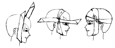 (2)取1/3处托住下颌,长端经耳前绕过头顶至对侧耳前上方,于另一端交叉,分别绕至前额及枕后于对侧打结固定。