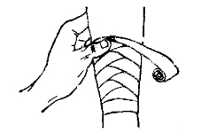 (2)在腕部做几圈环形包扎,再将绷带向上缠绕前臂(小腿)至手掌侧面(手背侧面)时绷带向下反折,反折时以左手拇指按住绷带上的反折处,右手将绷带反折向下,然后缠绕肢体拉紧,并盖住前圈的1/2~1/3,每圈必须反折,最后环绕2圈固定。
