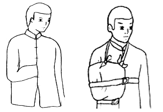 (1)伤肢屈曲贴于胸前,将手插入第3和第4纽扣间前衣襟内。
