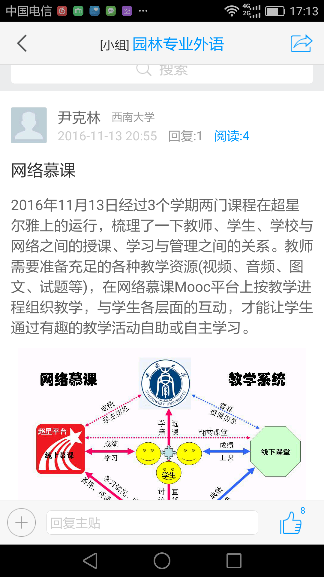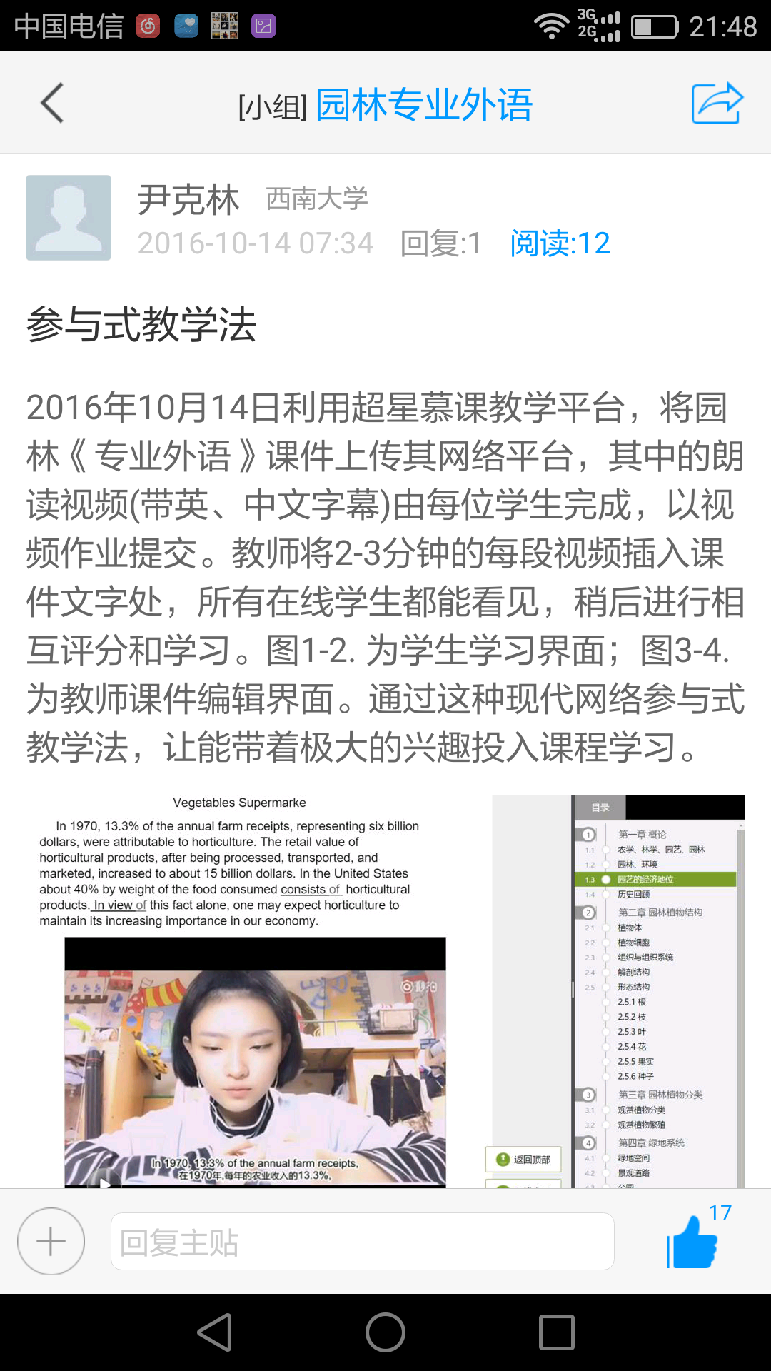 园林专业外语是西南大学园艺园林学院尹克林老师开设的一门专业课,课程从2016年9月到2017年1月,课程主要以混合式教学方式展开,学生平时在网络上学习内容,收看教师直播,并在平台上完成作业,获得相应成绩。