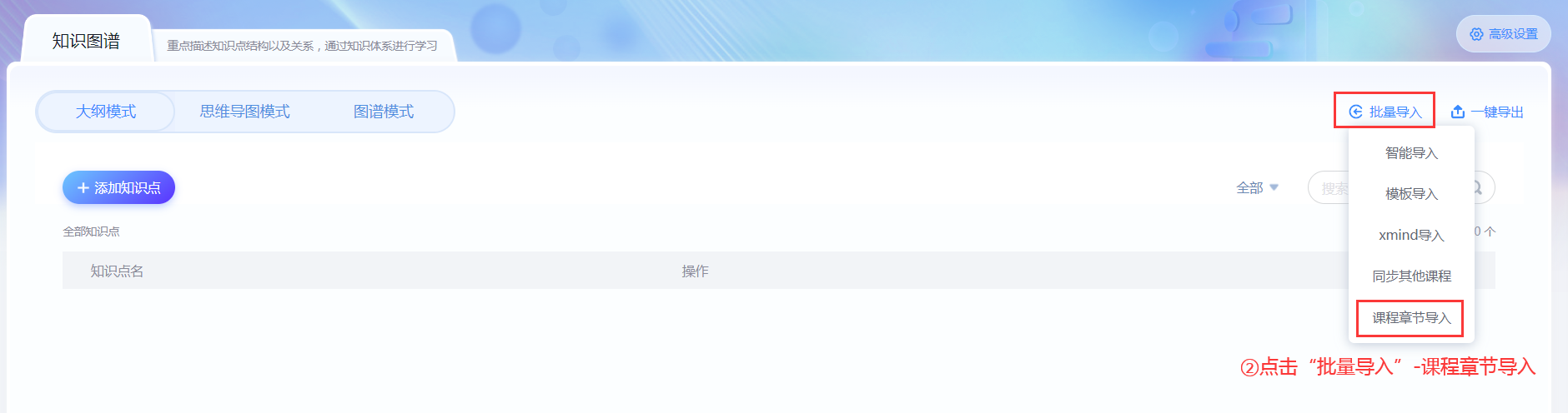 2.进入“知识图谱”界面,点击“批量导入”—“课程章节导入”
