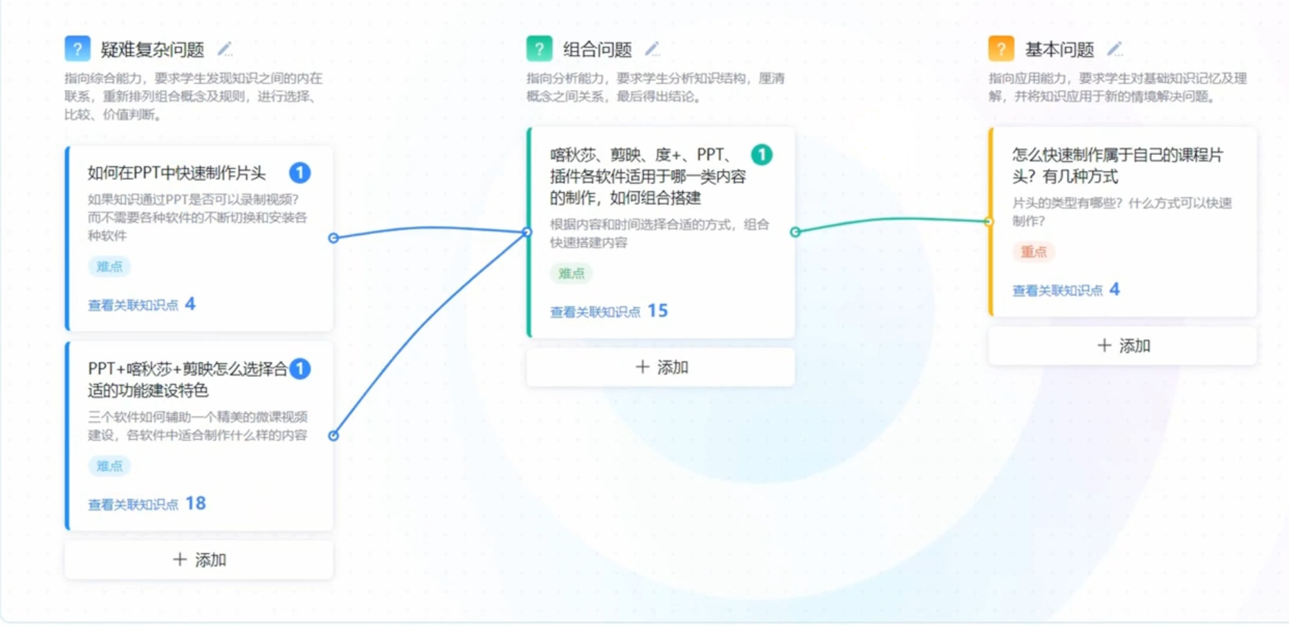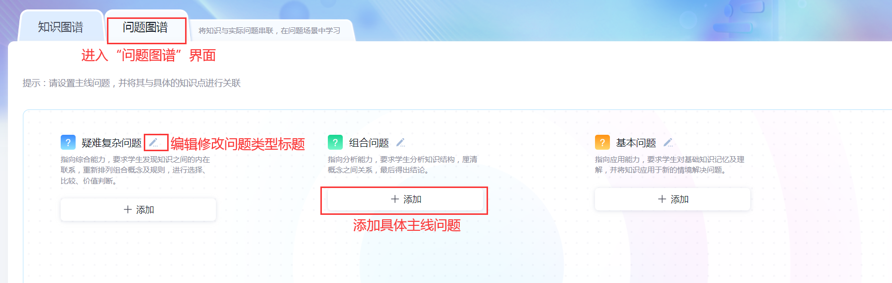 4.进入问题图谱界面,系统自动生成三种类型的问题,可以点击标题旁边的小笔进行问题类型标题的修改。在具体问题类型下点击“+添加”,添加具体主线问题