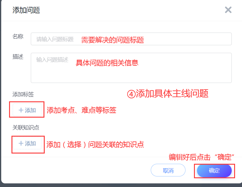 5.编辑需要解决问题的具体名称、描述,关联问题知识点,添加问题标签后点击“确定”添加问题