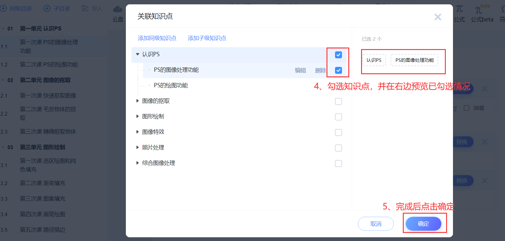 3、点击【关联知识点按钮后】即可进入知识点勾选页面,勾选视频/文档对应的知识点内容,支持多选,勾选后右边有关联知识点的数量和内容,无误后点击确定即可将视频/文档关联上对应知识点