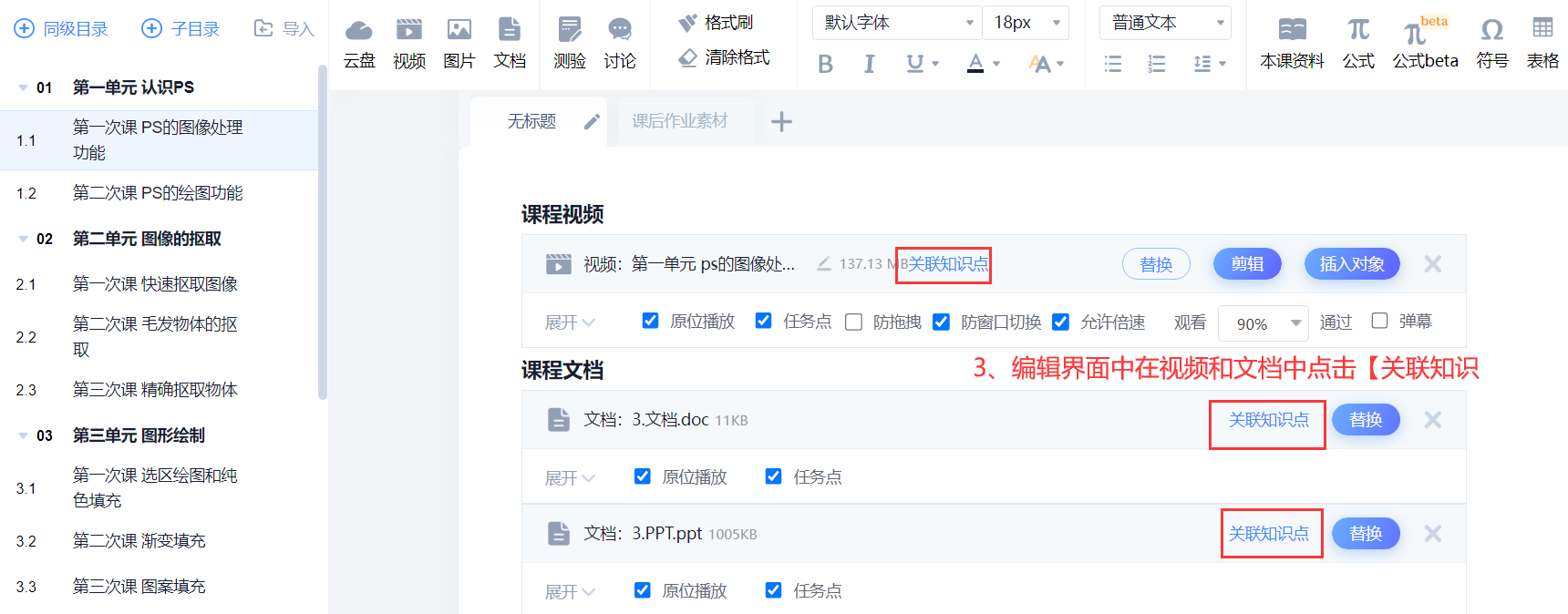 2、编辑界面中的视频和文档中都会有【关联知识点】的按钮