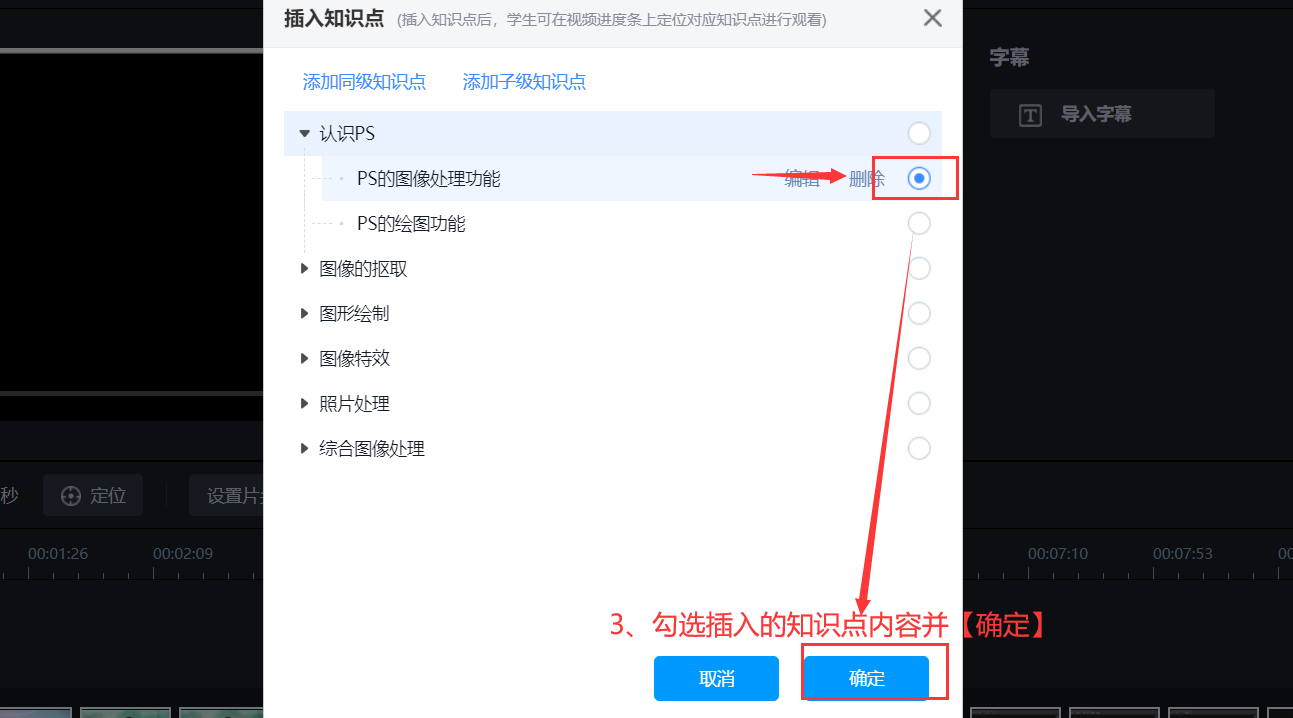 如果一个视频包含多个知识点,更加精准地将知识点定位到视频位置则可按以下操作
