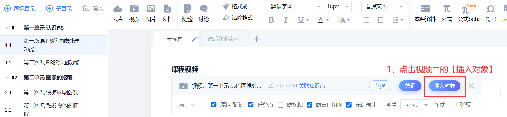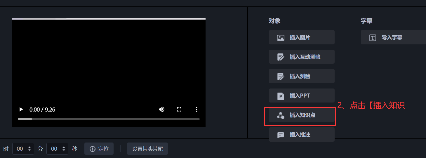 1、章节编辑界面中,在视频右边点击【插入对象】