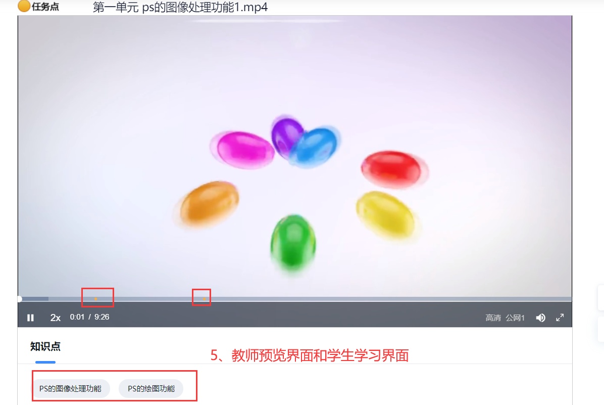 5、教师预览界面和学生学习界面都可以看到视频下方的知识点,可以通过点击下方的知识点或者播放轴中的小黄点来定位到知识点的视频时间点。