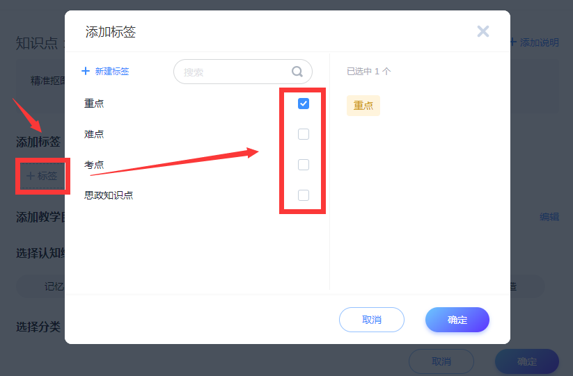 【添加标签】中标记重点、难点、考点和思政点,默认有四个,可以创建自定义标签
