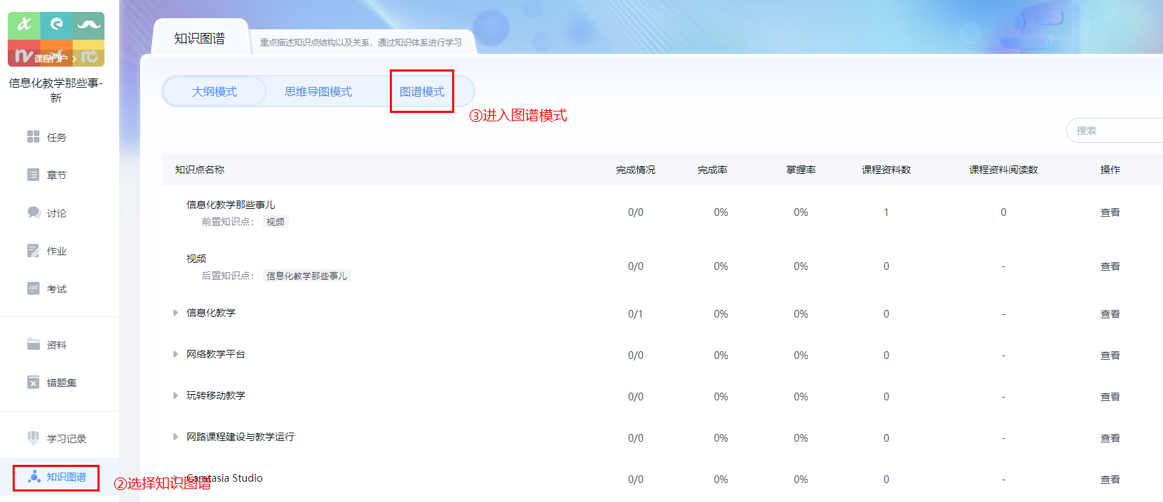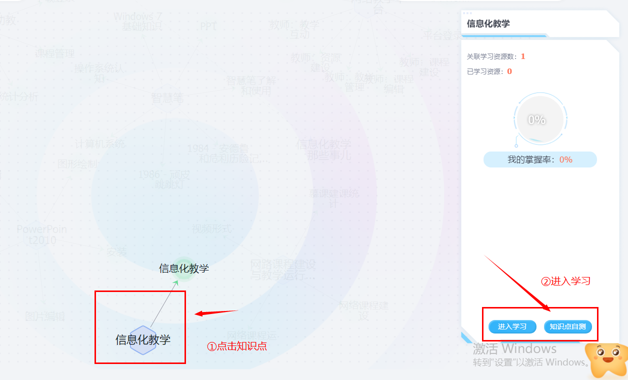 4、选择知识点,可查看到知识点关联学习资源数及已学习资源,并可【进入学习】或【知识点自测】