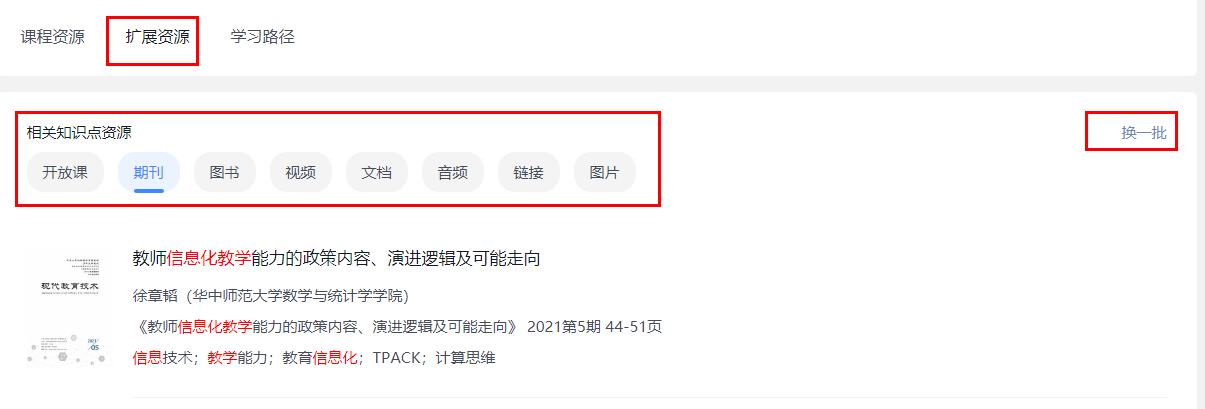 6、【拓展资料】课查看相关知识点资源,【期刊】【图书】【视频】【文档】等,也可进行【换一批】操作