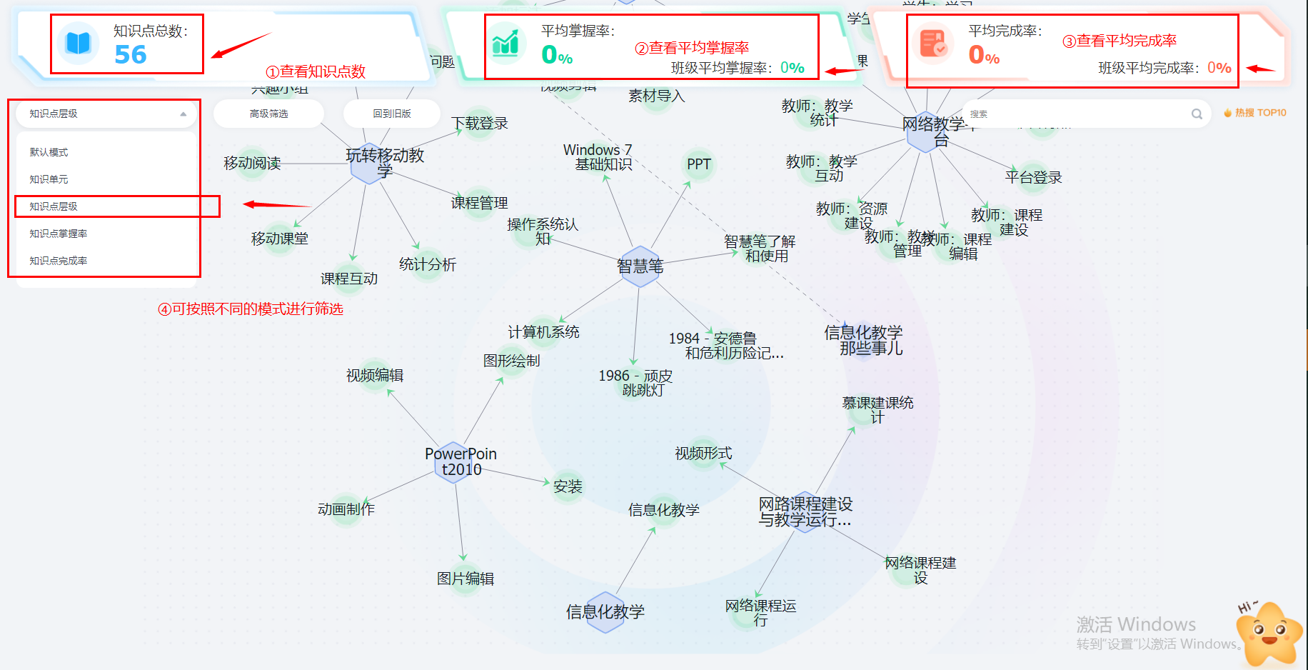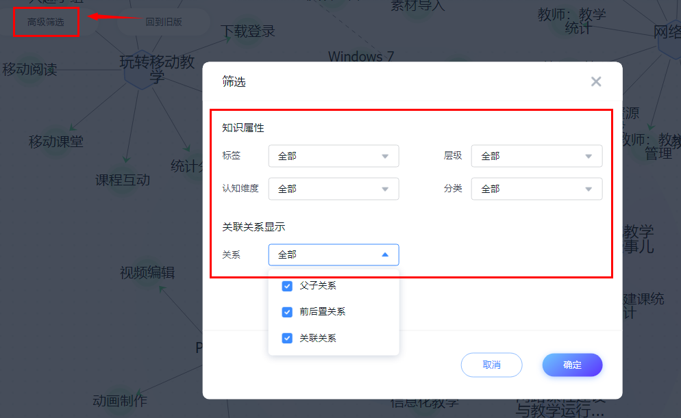 3、【高级筛选】里可筛选,不同知识属性的【标签】、【层级】、【认知维度】、【分类】,【关联关系显示】筛选
