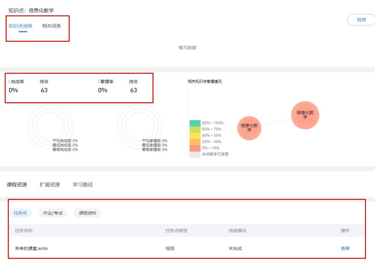5、可查看对应【知识点说明】、【相关词条】;对应本知识点完成情况、排名等;【课程资源】中,对应的【任务点】、【作业/考试】、【课程资料】都可进行学习查看