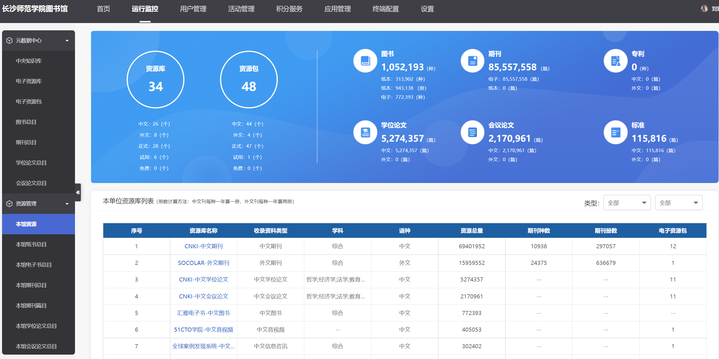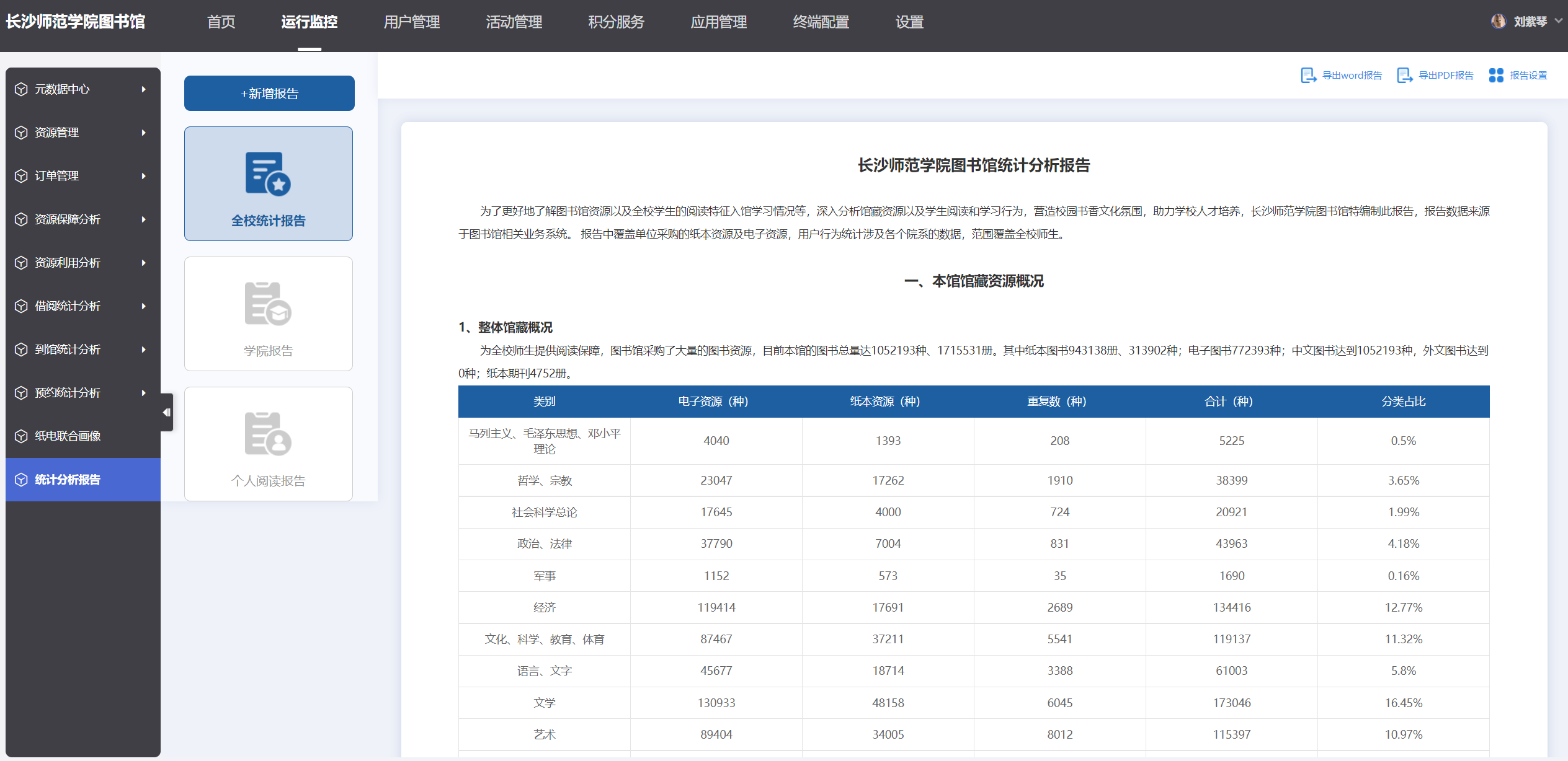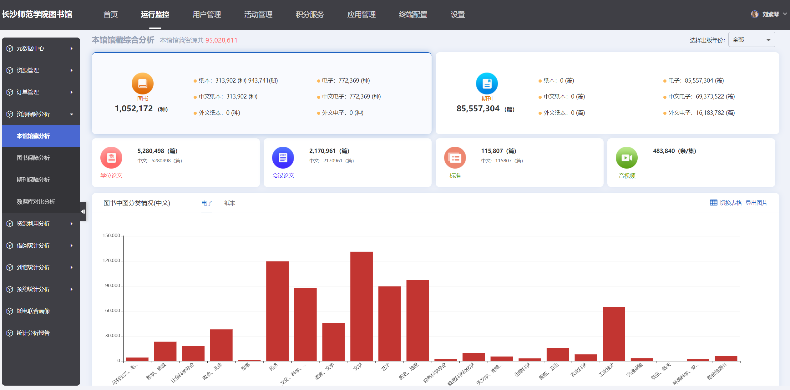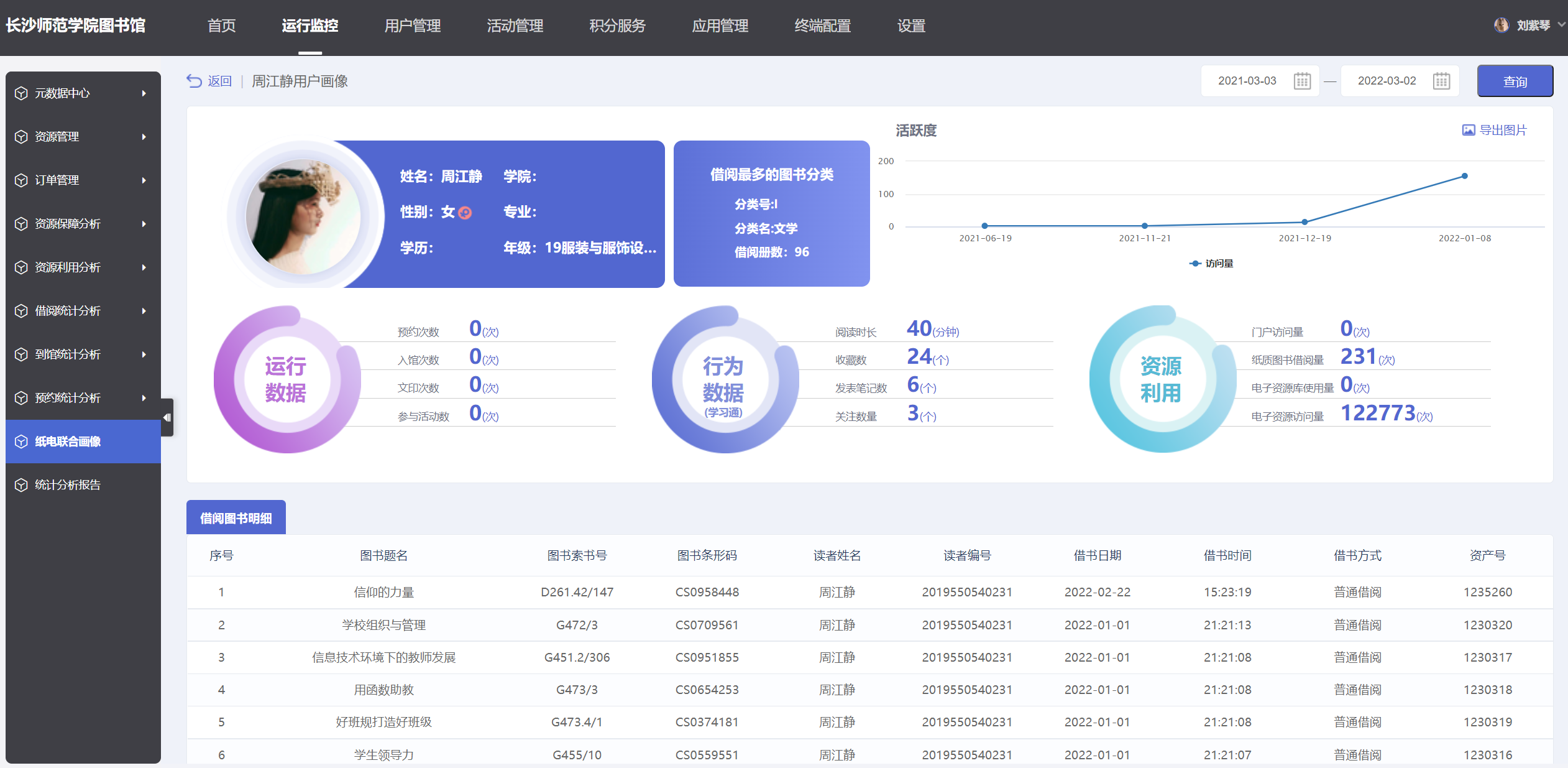 【通过推送借阅记录、门禁记录,对接电子资源管理系统、活动管理系统、学习通数据等,形成纸电一体的数据中心。包括有行为数据分析与展示、个人用户画像、统计分析报告等】