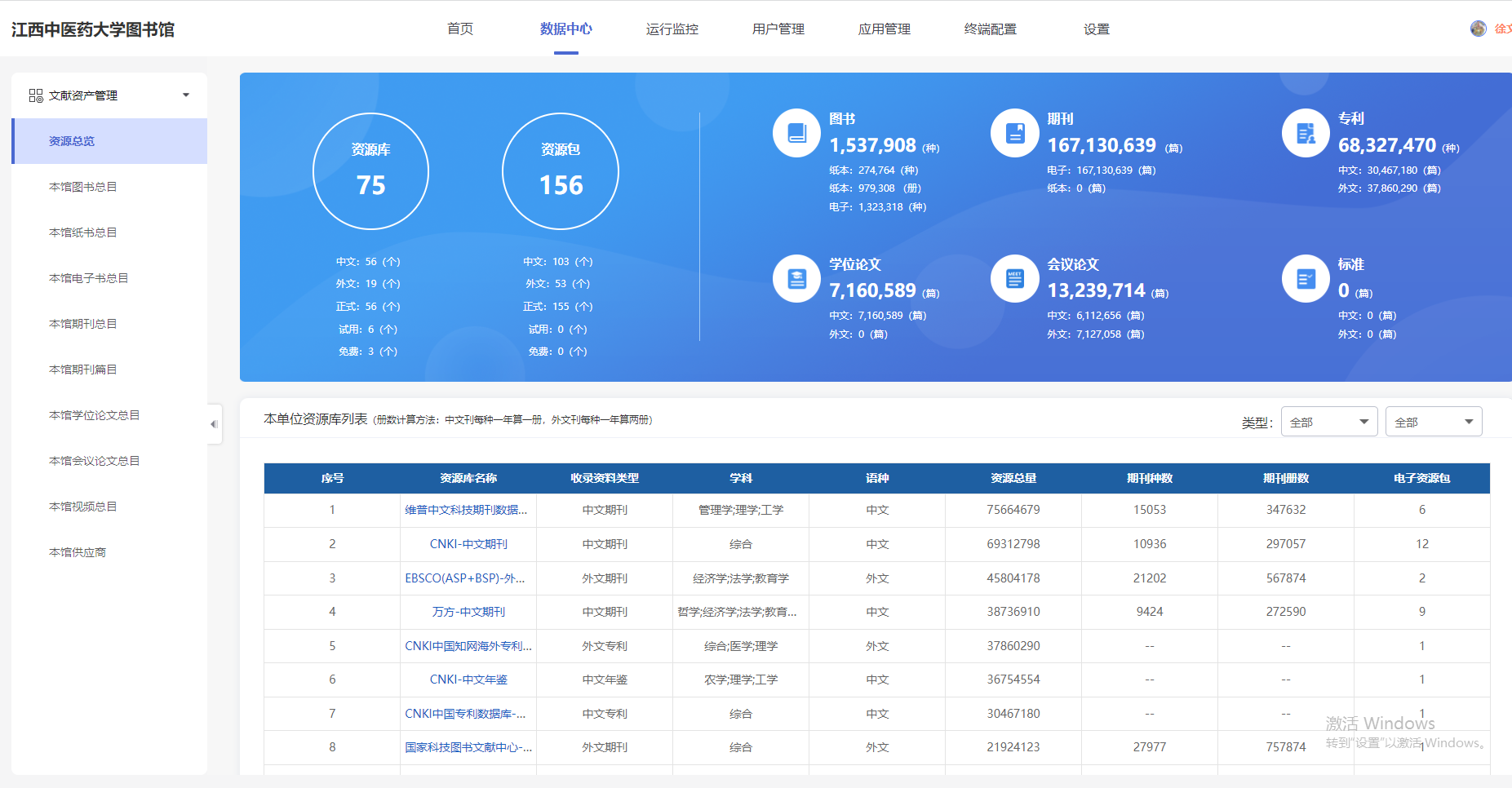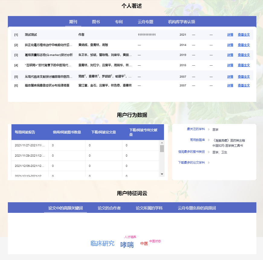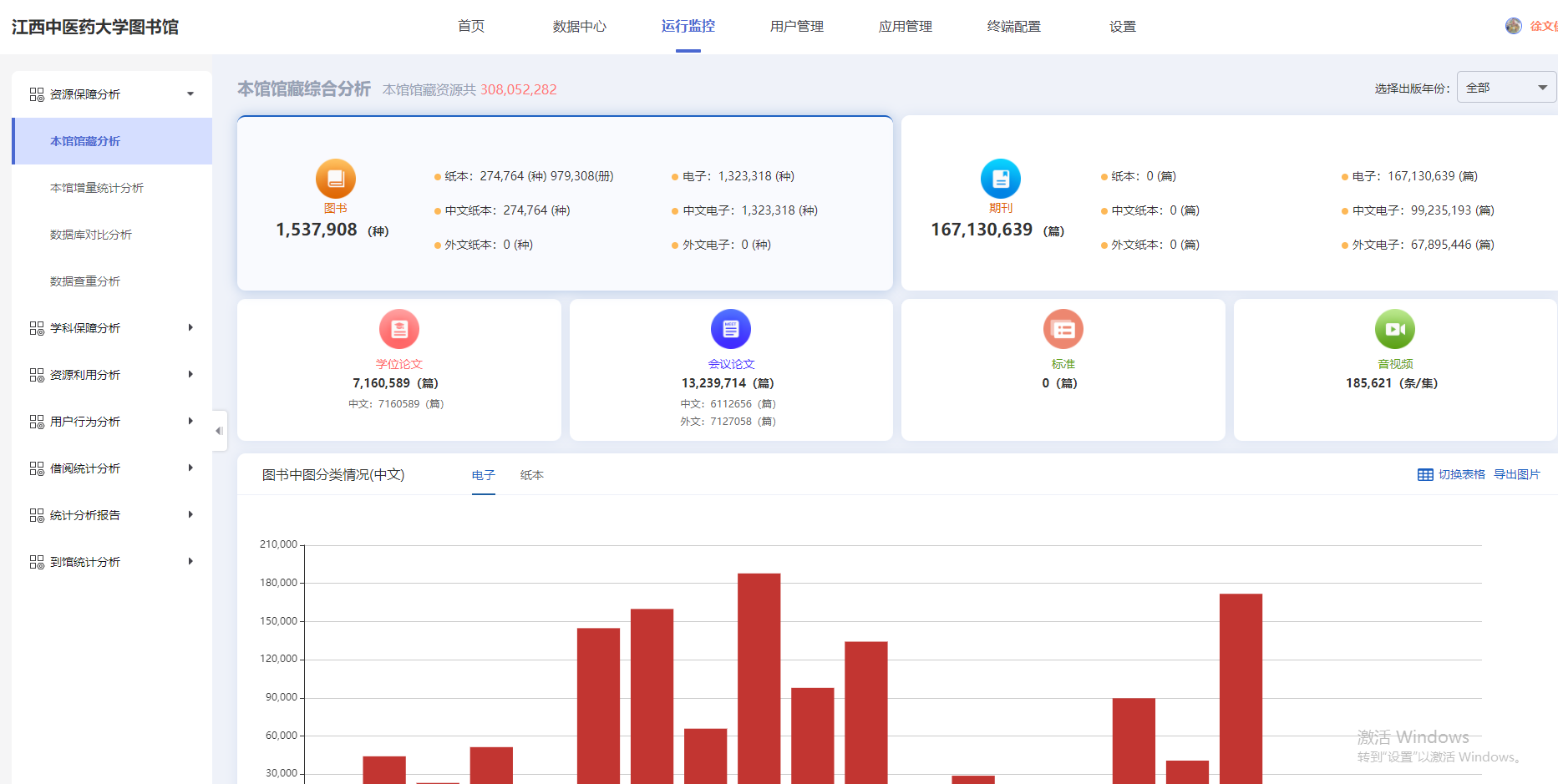 2、运行监控:资源保障、学科保障、资源利用、用户行为、借阅统计、统计分析报告、到馆统计。