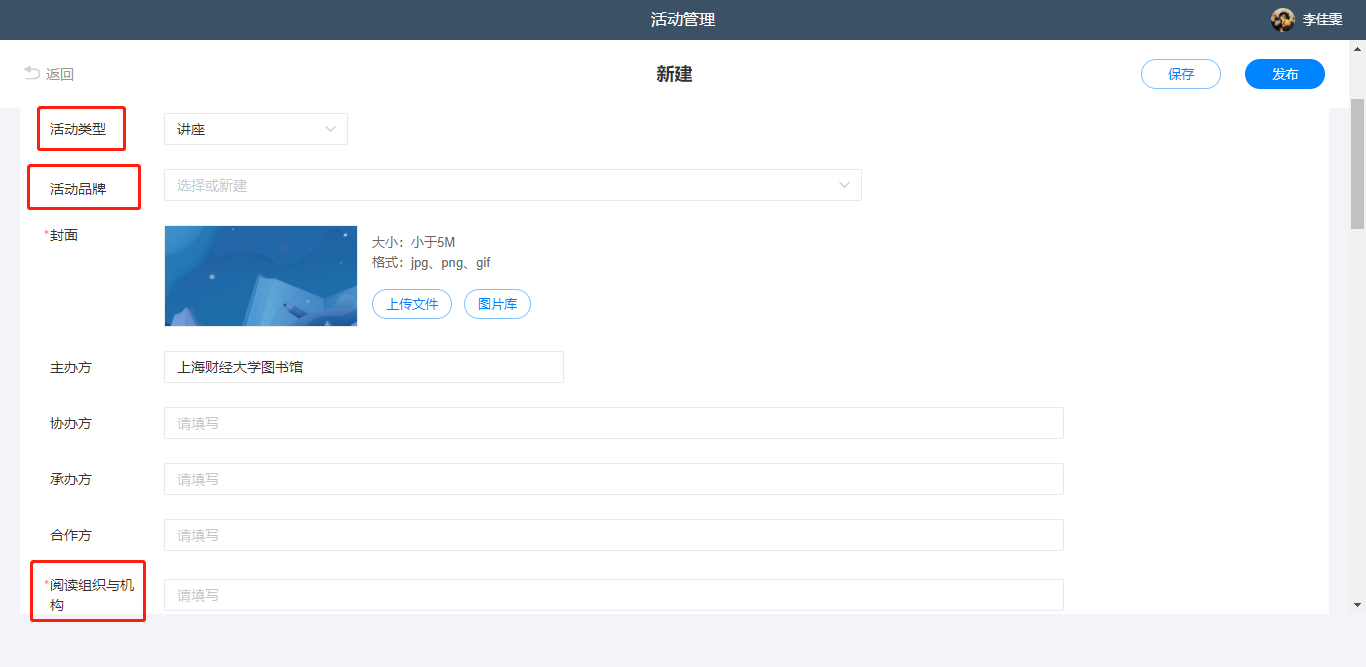 根据项目的需求,对活动管理后台的字段进行设置,新增了【活动类型】【活动品牌】【阅读组织与机构】这一系列特有的字段,并配置在智慧门户相应的页面进行活动的展示。