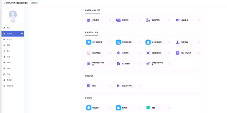 支持不同的角色配置不同的个人空间页面,提供包含图书馆服务和资源等模块的应用中心,基础功能模块包含:首页、应用、通讯录、笔记、云盘等。