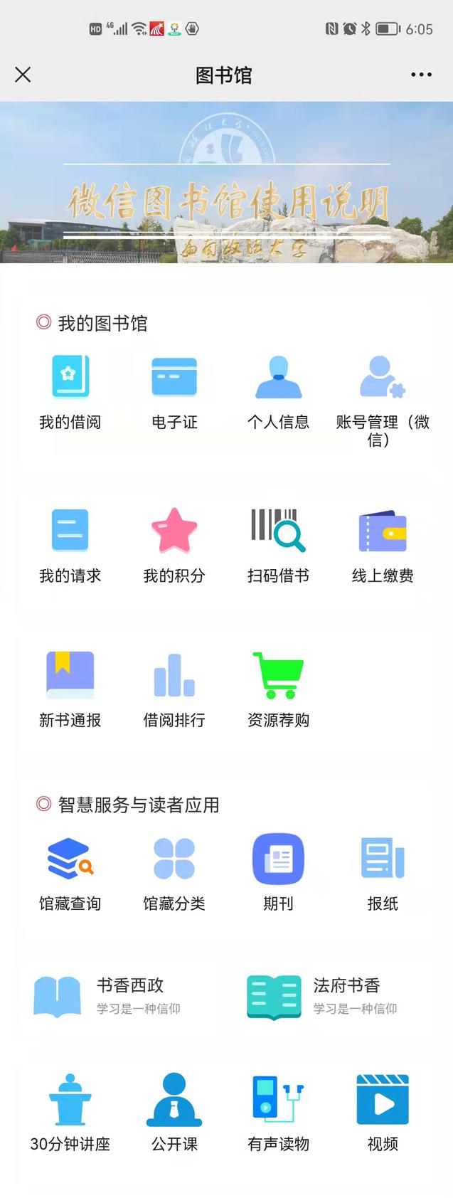 (2)微信端:具备借阅信息查询、电子借阅证、请求、积分查询、资源荐购、线上缴纳欠款、扫码借书、馆藏查询、新书通报等相关功能;