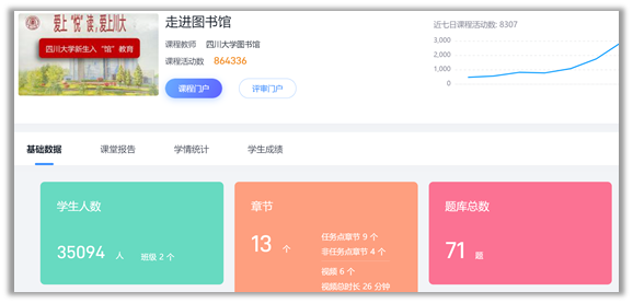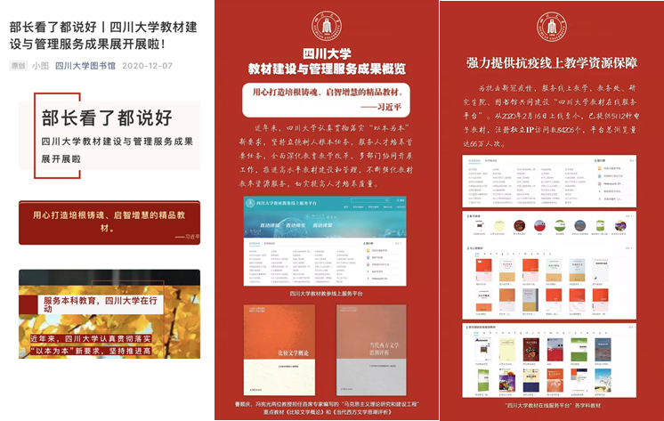 基于微服务平台和海量图书数据打造的四川大学教材教平台总教材教参信息已达10086条,平台馆藏信息匹配总量达7300条,涉及46个学院等教学科研单位,按学期累计和更新。截至本学期(2021年底),平台访问量达182,848人次。