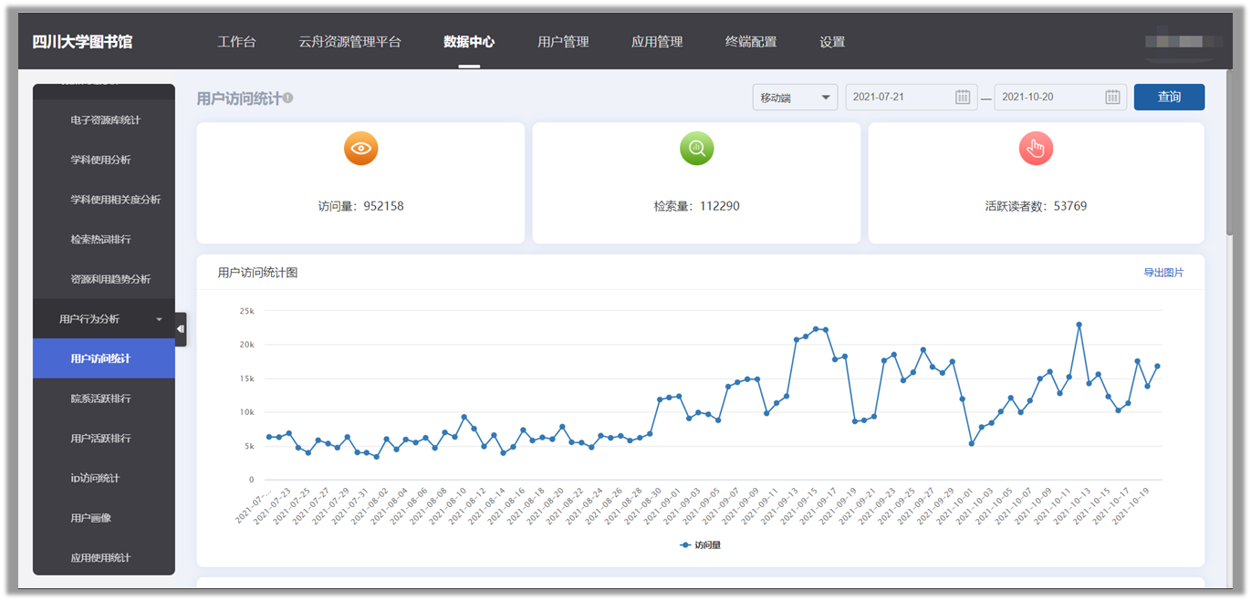 移动端学习通APP对图书馆的实体馆和在线馆形成互补,完善图书馆用户的使用空间,实现移动阅读、培训、办公和社交等功能,打造图书馆的移动阅读学习生态体系。移动端作为重要的资源获取补充渠道,访问量为952,158次,资源检索量达112,290次。
