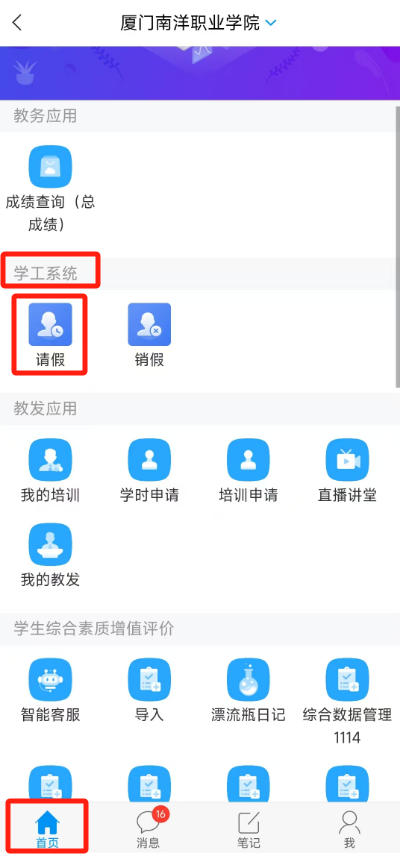 (1)登录学习通,在首页找到【厦门南洋职业学院】-【学工系统】-->请假,如下图。