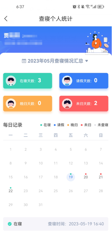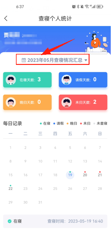 可切换查寝月份进行查看,点击日期可查看当天查寝打卡结果。