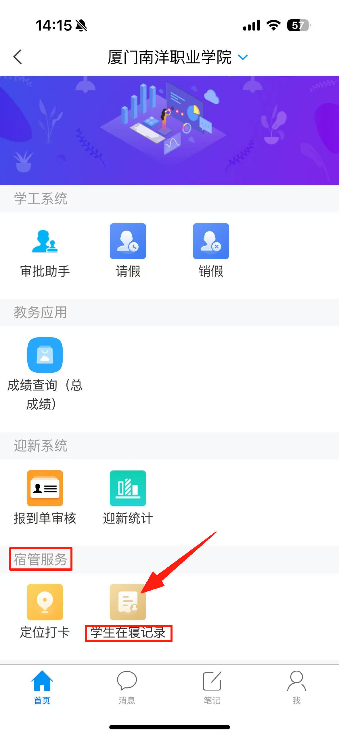 (1)登录学习通,在首页找到【宿管系统】-->学生在寝记录,如下图。