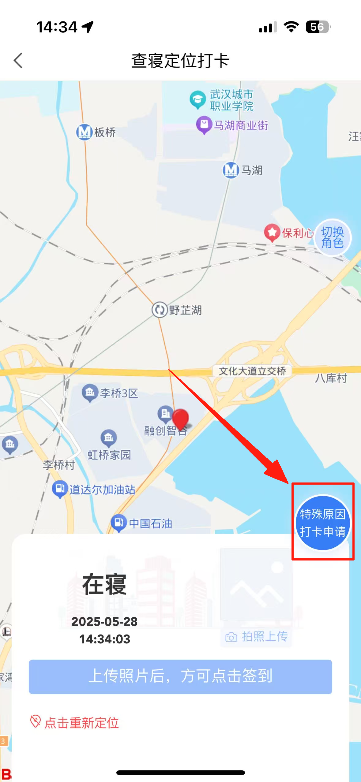 (1)当遇到特殊原因无法签到时,可点击右下方特殊原因打卡申请,如图。