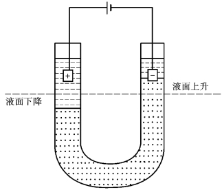 (4)胶体的电泳。如图9.3所示,将自制的Fe(OH)3 溶胶放入U 形管中,在管左右两边沿管壁小心滴入2~3 mL 电解质溶液(导电作用),使电解质与溶胶之间保持清晰界面,内边分界面要高度一致。插入电极,通电,观察现象。