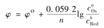 若两者标准电极电势数值相差不大,则要考虑浓度对氧化还原反应方向的影响。利用25 ℃时,能斯特方程
