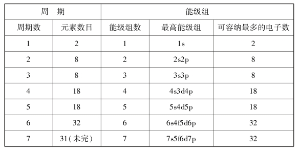 从表2.7中可以看出,元素所在周期数即为该元素电子排布的最高能级组数,且与电子层数相一致。如K 和Cr 的最高能级组数均为4,电子层数也为4,故这两种元素都在第四周期。