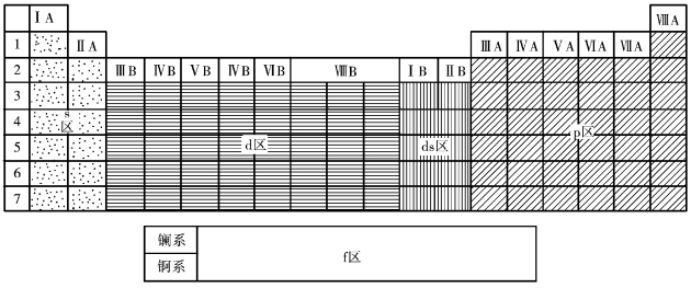 (3)原子的电子层结构与元素周期表的分区。根据各元素的电子层结构特征,又可将元素周期表简单划分为五个区,即s 区、p 区、d 区、ds 区和f 区,如图2.9所示。